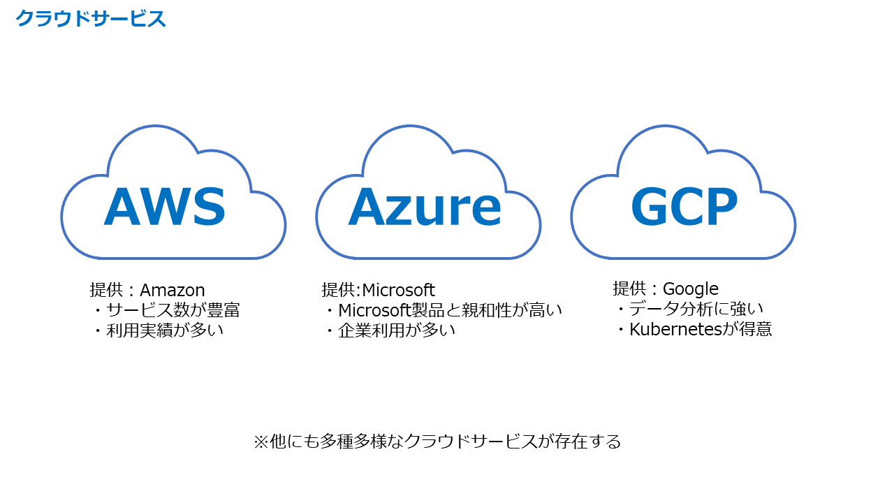 クラウドサービスにはAWS以外にも複数存在し例えばMicrosoft社の「Azure」やGoogole社の「GCP(Google Cloud Platform)」などがあります。